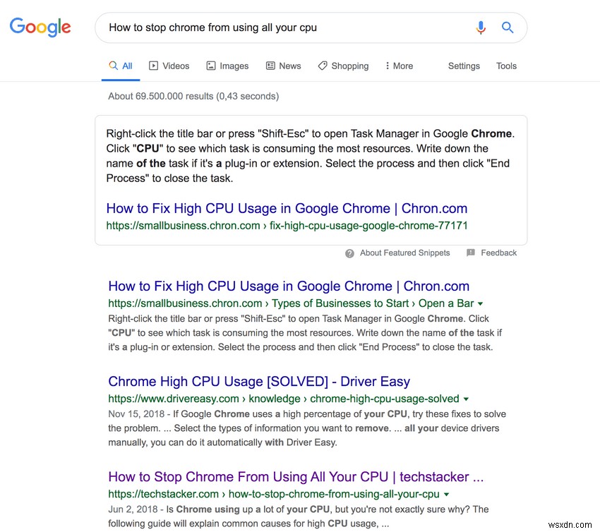 जैसा कि आप ऊपर देख सकते हैं, आपके शीर्षक के बाद आपकी सामग्री का पहला पैराग्राफ (मुख्य पैराग्राफ) आता है, जिसका अर्थ है कि आप अपने लेख या उत्पाद पृष्ठ में सबसे पहले टेक्स्ट ब्लॉक की संरचना कैसे करते हैं, यह महत्वपूर्ण है। खोज परिणाम पृष्ठ केवल पाठ का एक छोटा स्निपेट दिखाते हैं, इसलिए इसे गिनें।